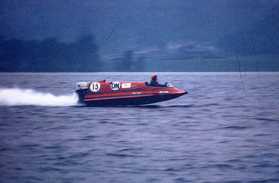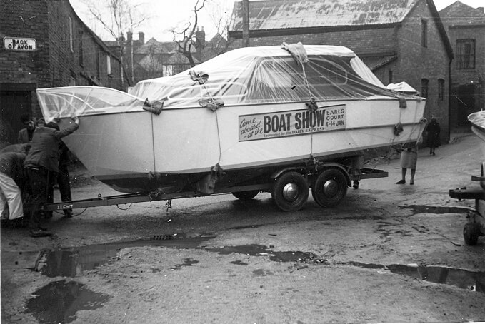First run: his engine seized up. Telephone call to Tewkesbury and a driver left his yard at Back of Avon with a replacement 135 b.h.p. Johnson engine, arriving only just in time. The motor changed, for his successful world record attempt. Tewkesbury Stinger completed only ten days before -no time to test it.