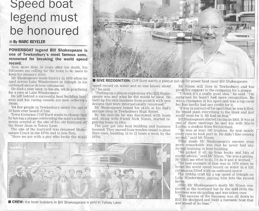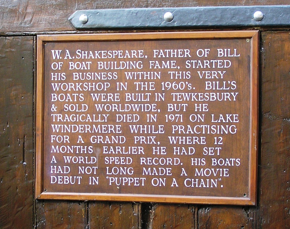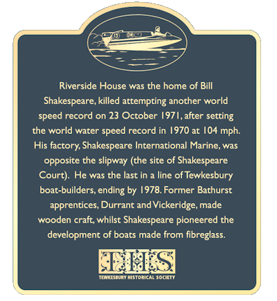 Using family legacies, he set up his own boat building company concentrating in harnessing power to elegant yachts, starting from a family shed in Red Lane and then moving south along the Mill Avon to set up his own Shakespeare International Marine, adjacent to where the plaque is placed on his former home and offices, Riverside House. The factory has now been demolished and replaced by residential flats, adorned with his name, Shakespeare Court.