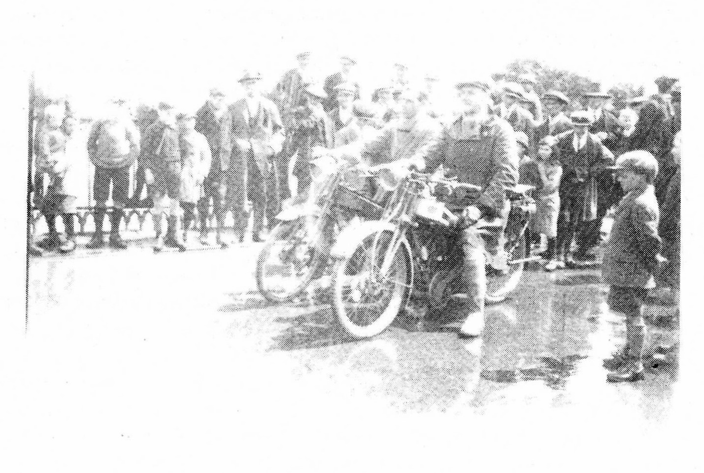 Photograph 5 shows two motorcyclists apparently (against the odds) trying to ride out of town through the floods. The crowd had gathered to see if their attempt proved successful. Motorcycling had an almost pioneering glamour in the 1920s, so the riders’ bravado was very much in keeping with the age. Although the identity of one of the motorcyclists remains unknown still, the one on the right was recently confirmed to be Harry Bayliss, a labourer from Forthampton, and the names of many of the individuals behind or around them have now been traced. Going from left to right, there is Mrs. Hopton and her daughter, Frances. A couple of faces along we think are Mr. Heath, Mr. Spiers, Mr. Lewis and Mr. Greening, in front of whom is Mr. T. Woodward. After a couple more places there are B. Underwood and next to him, F. Walker. Finally, close to the right-hand side of the photo are Fred Green, Bill Cull and, in the foreground, A. Hodges.