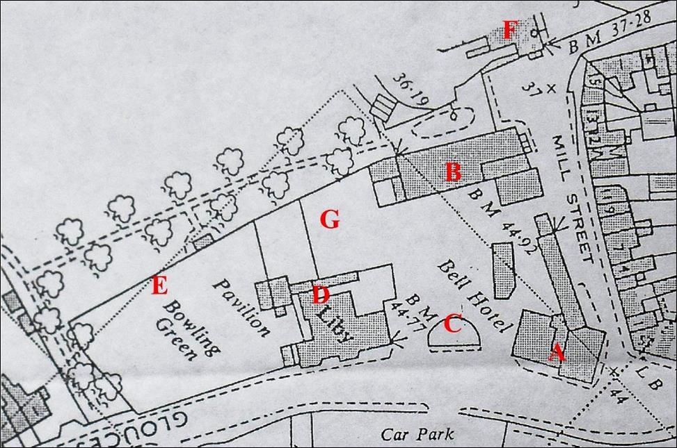 Lot 2: All that well accustomed INN or PUBLIC HOUSE called THE BELL INN, situate near to the Abbey Church on the entrance from Gloucester and Cheltenham, with excellent stabling, Brew House, Cellaring, Large Garden and Piggery attached thereto, now in the occupation of Mr Barnwell Whitmore as Tenant. [A] Lot 3: All that very desirable and celebrated BOWLING GREEN adjoining to Lot 2 with a Summer House, Arched Cellar, and other conveniences forming a most desirable situation for building upon. [E]