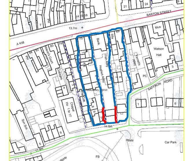 Fish Alley doesn’t follow the regular layout. The entrance off Barton Street was lead on to a labyrinth of small courts cheek-by-jowl with cottages; nineteen of them altogether. This made it one of the most heavily populated alleys in the town. An unusual feature is the dogleg in the alley, which is a result of its unusual layout. Fish Alley lies behind two front houses. Behind No. 69a, the front building, is an open area and the alley changes sides, to the plot behind No 70 down to Swilgate Road. Once, these two sections were called Fish Alley East and West. This created room for courts and ‘back to back’ high-density housing.