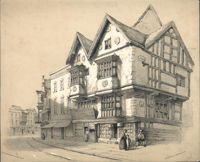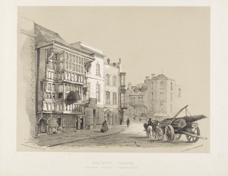 George Rowe drew and printed exceptionally important prints of buildings still present in Tewkesbury. They give us an idea of the importance and condition of these old buildings before photography. That they were subjects at all tells us that some people in the early nineteenth century respected and marvelled at their heritage before it became fashionable. Publishing them widely for the curiosity of a paying public perhaps saved these buildings. We also have Thomas Collins to thank for their physical rescue and restoration and we can conjecture there were many in the town who treasured them. All these buildings were considered 'ancient' even in the 1830's and survivors from undocumented times. These prints are reproduced here but originals can be found in the Tewkesbury Museum in the Victorian Room.