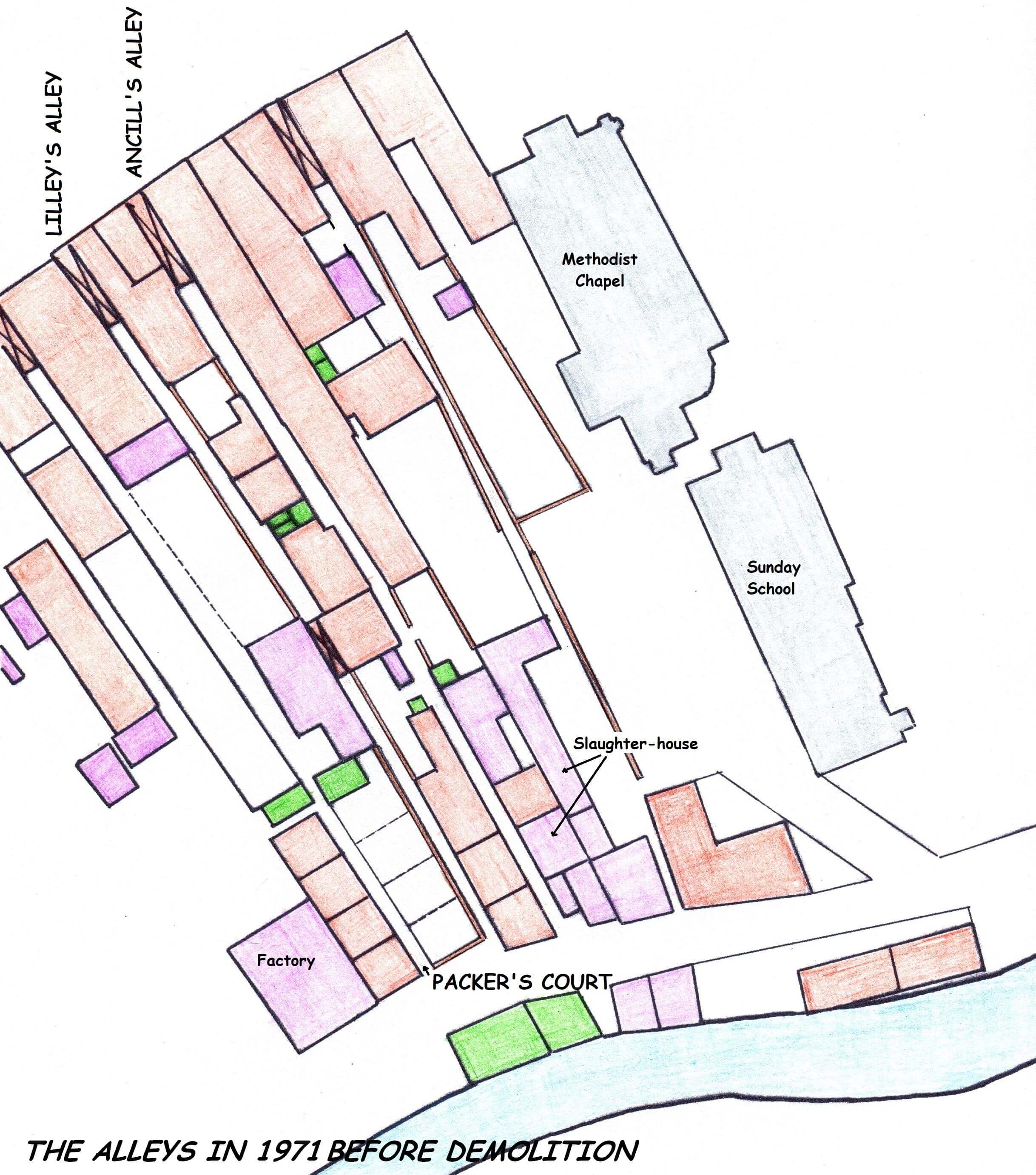 In common with the other alleys stretching down to the Swilgate Road, there were tragedies with young children drowning. The safety logic seemed to be that there were always children playing there, so help would quickly be sought if someone fell in. It worked in 1904 when Mr Deveraux’s five-year-old daughter was rescued by Stephen Healy, working in the slaughterhouse in Ancill’s Alley nearby, but not for four-year-old Mary Ann Maycock, who drowned there in 1951. These alley tragedies were the reason why fundraising for an indoor swimming pool was so important to residents.