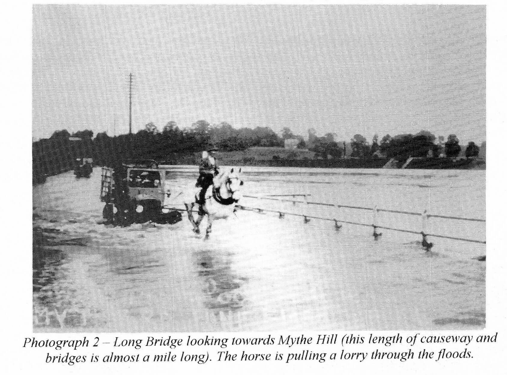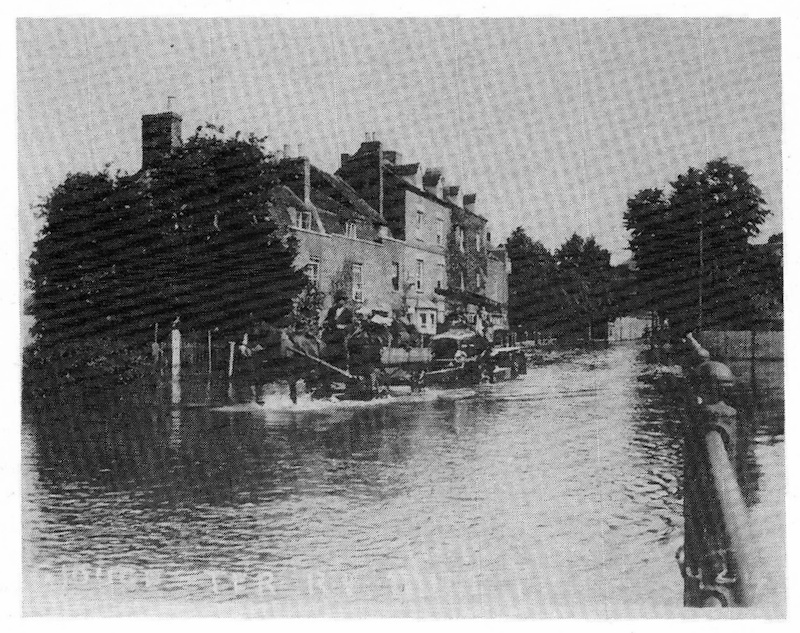 The shot of a horse pulling the fire engine through the floods on Gloucester Road (photograph 4) is of particular significance. The row of houses in the background, now known as Abbey Terrace, was then called Gloster Row. As Tewkesbury did not have its own motorized fire engine until 1934, the engine in the picture is believed either to have come from Gloucester or be en route to Cheltenham. Mr. H. Walkley, one of the early founders of the Salvation Army in Tewkesbury, was owner of the horse and dray in front, and later became mayor of the town.